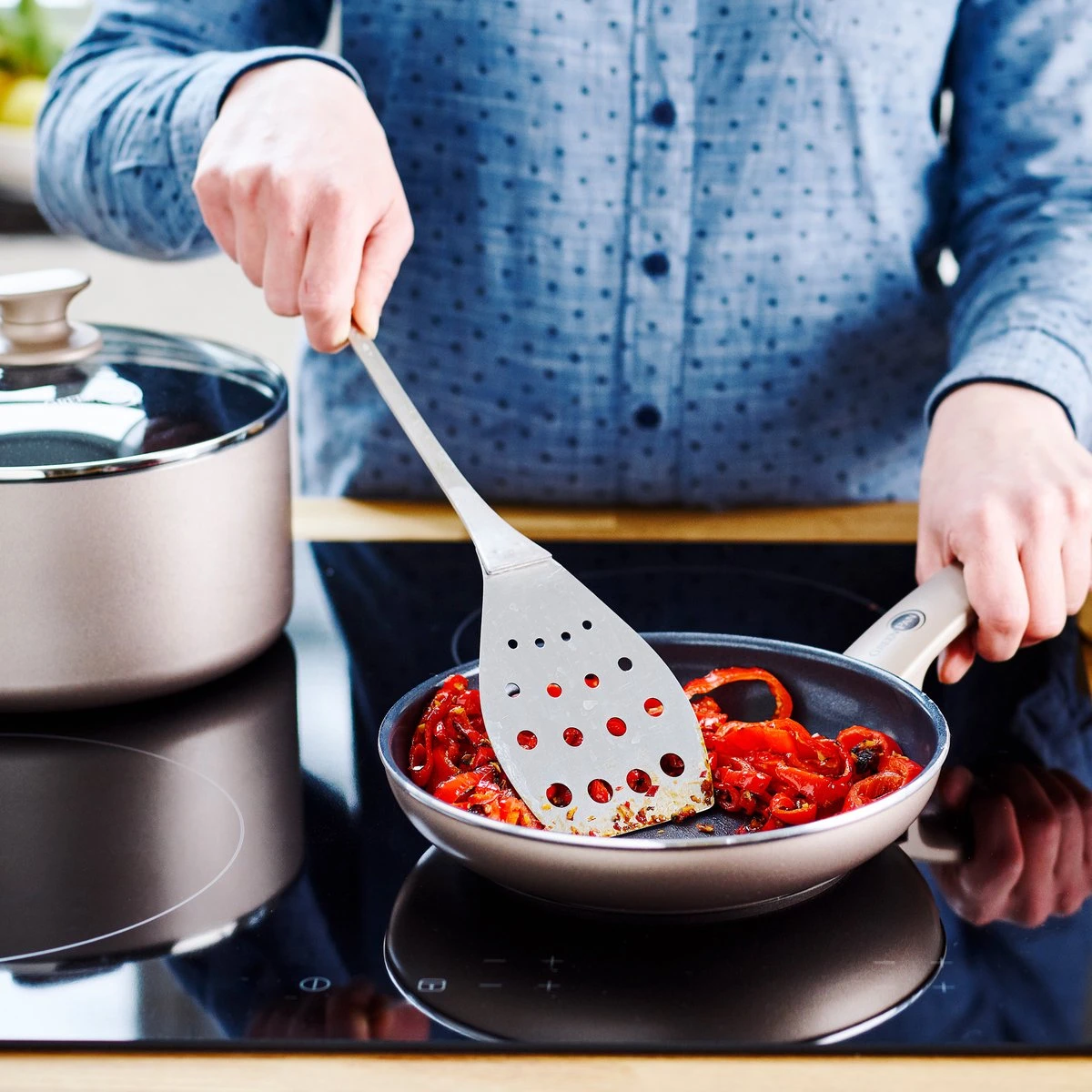 De PFAS-vrije GreenPan Cambridge Keramische Koekenpan – Ø 28 cm – Inductie in brons is heerlijk eenvoudig in gebruik en is geschikt voor alle warmtebronnen, ook inductie. De pan warmt snel en gelijkmatig op voor uitstekende bakresultaten. De Thermolon™ Infinity keramische anti-aanbaklaag is bovendien versterkt met diamant en bestand tegen metalen spatels.